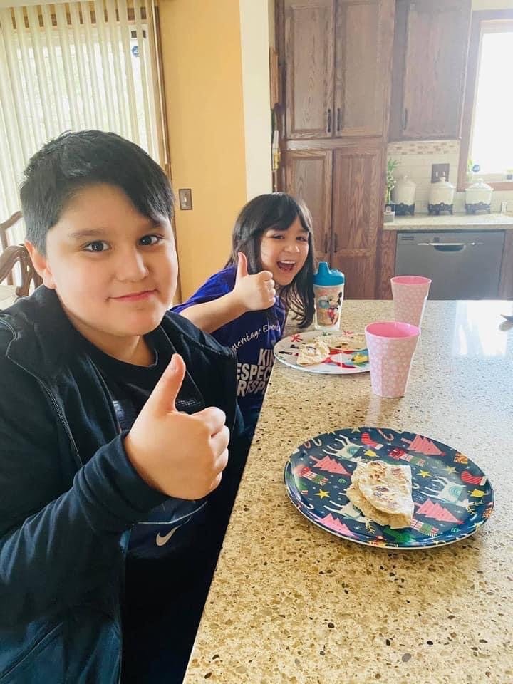 Jesus's niece and nephew enjoying his mom's home cooking.